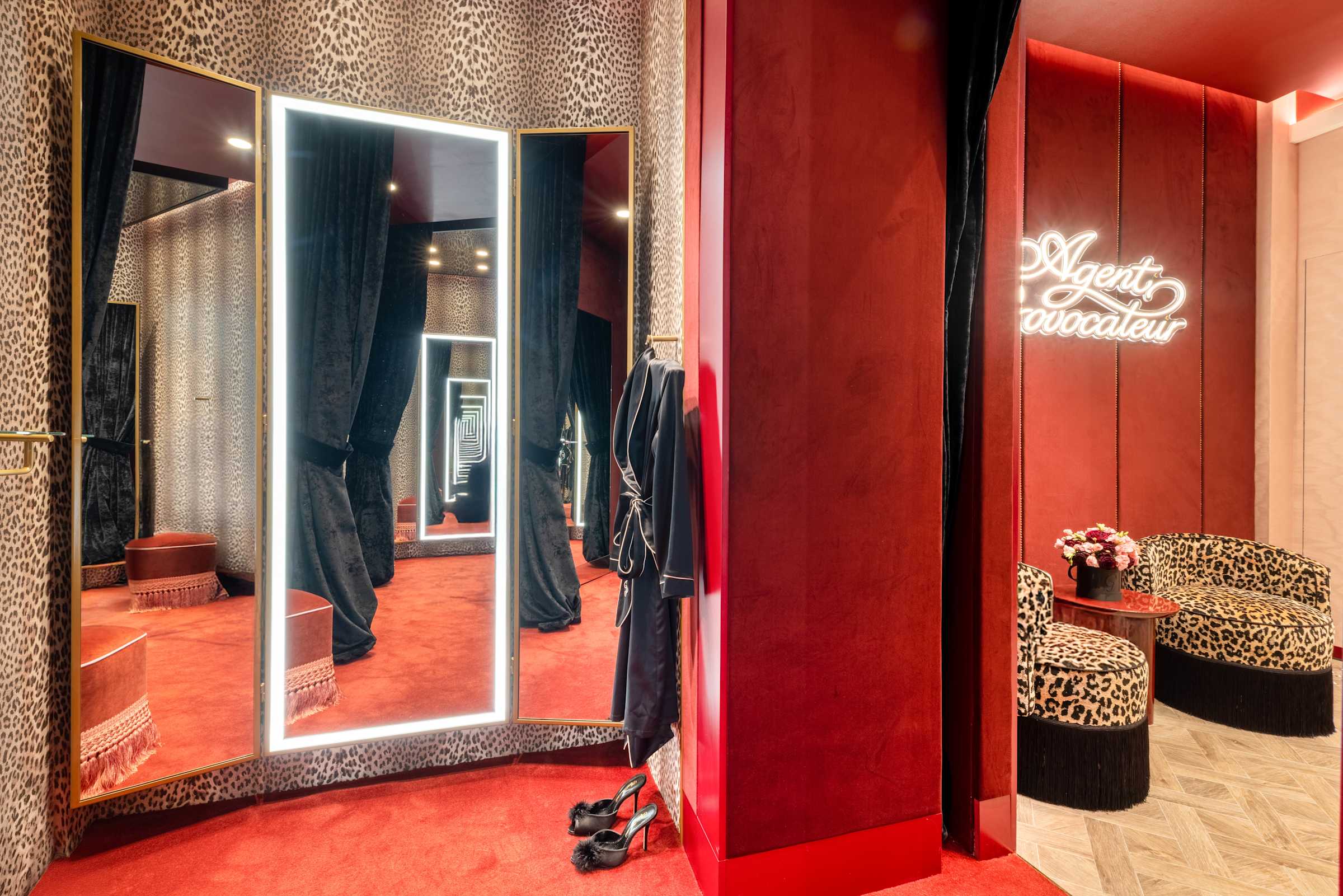 - The interior design translates Agent Provocateur’s iconic brand identity into a refined standalone boutique, featuring padded velvet studded wall bays and walls, a bespoke Calacatta marble cash desk, custom metal AP logo handle, illuminated branding, and mirrored fluted panels, creating a luxurious and immersive retail environment.