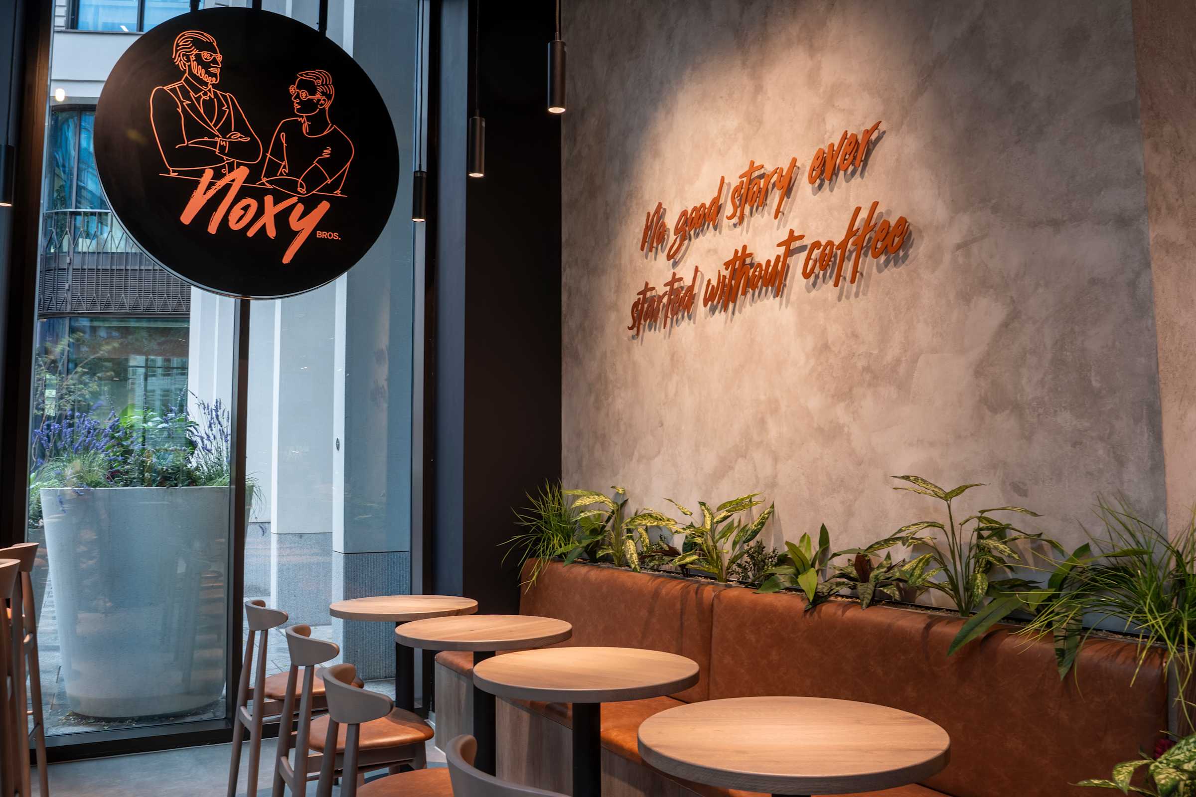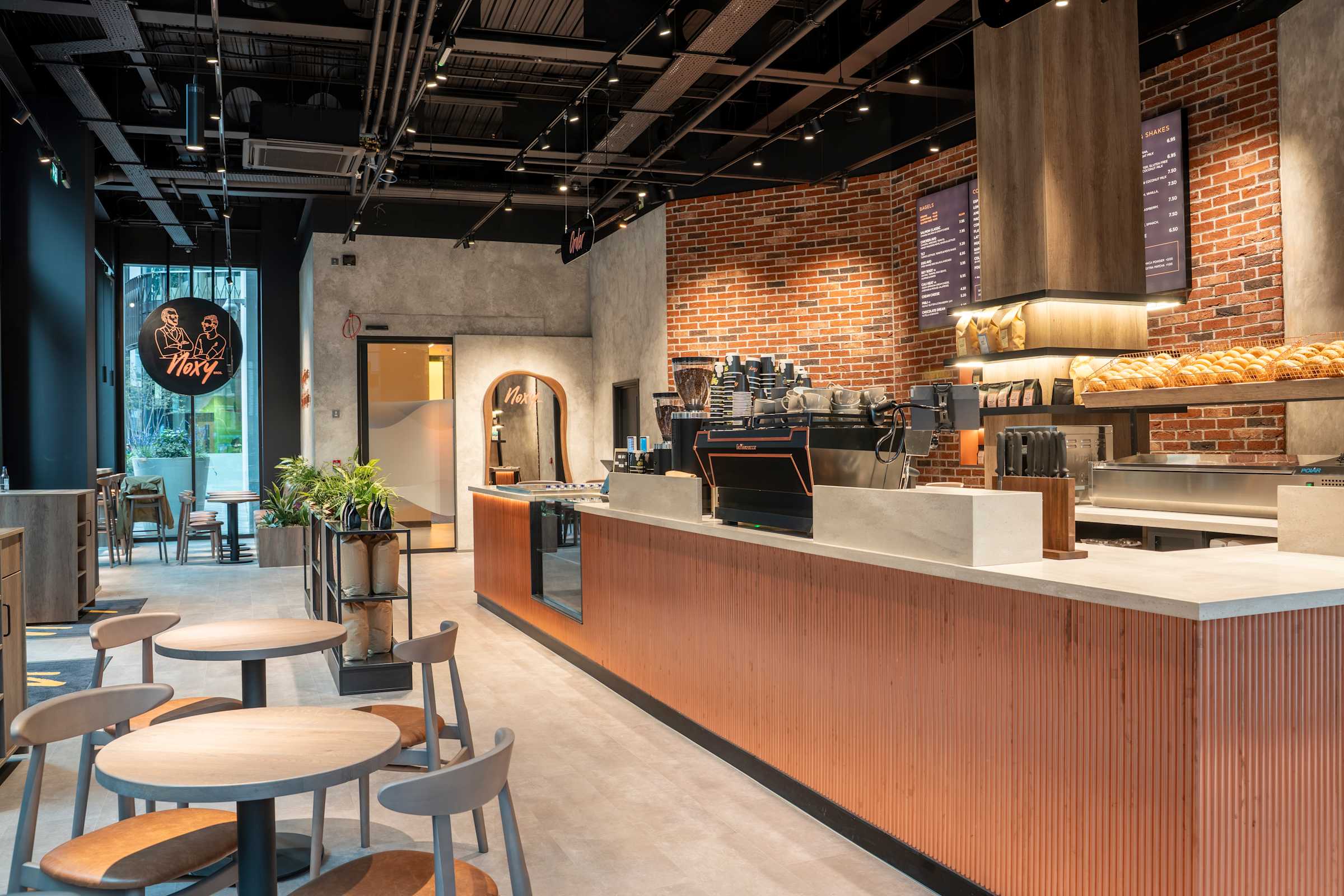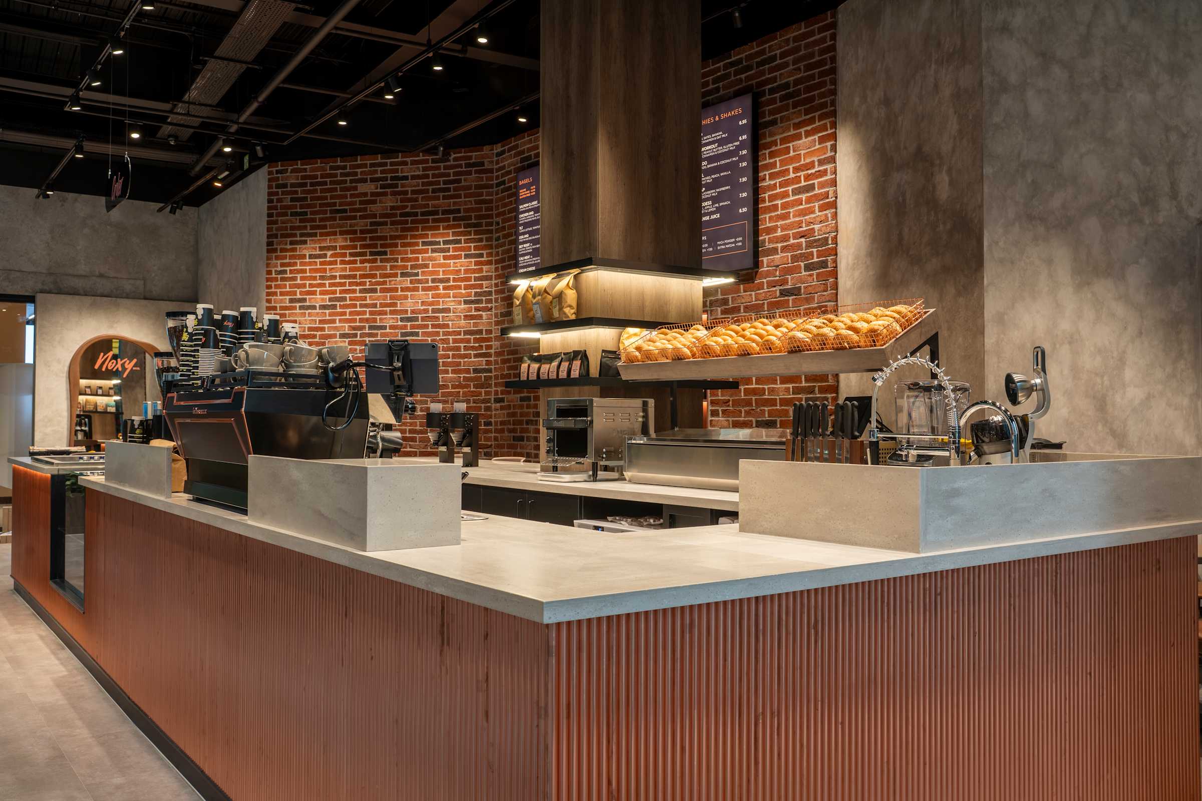 - A strong emphasis was placed on detail, materiality, and brand expression throughout the space. Bespoke joinery, interactive bar seating for filter coffee, dedicated areas for branded merchandise, custom signage, digital menu boards, and coordinated lighting design all contribute to a cohesive, distinctive flagship environment that reflects the Noxy Brothers identity.